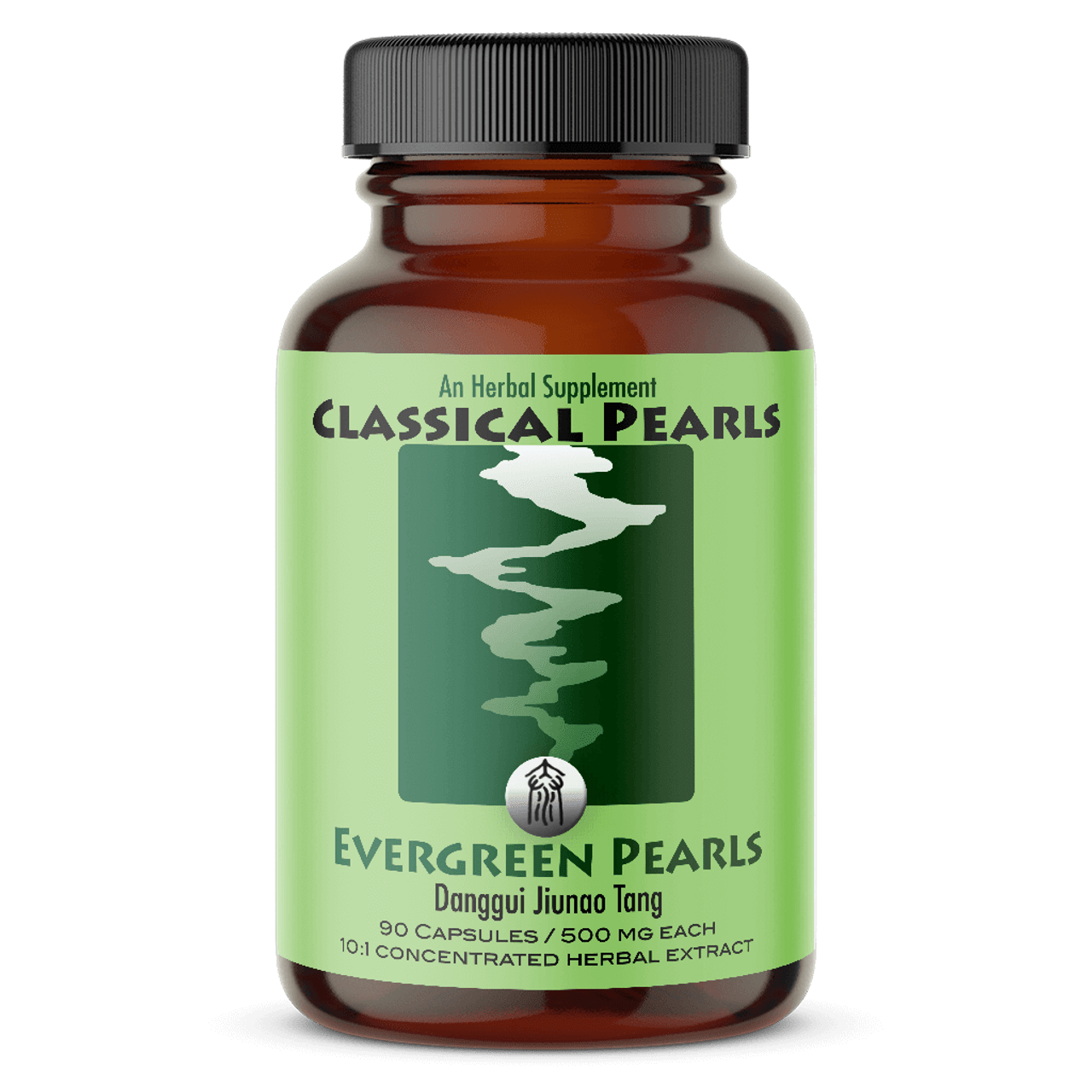 Evergreen Pearls is based on the deep reaching constitutional remedy, Danggui Sini Tang (Tang-kuei Decoction for Frigid Extremities). Danggui Sini Tang is the representative jueyin (Liver and Pericardium) remedy in Zhang Zhongjing’s 3rd century formula classic, Treatise on Disorders Caused by Cold (Shanghan lun). The added herbs give Evergreen Pearls a particular focus on circulatory disorders in the extremities and degenerative changes in the head, neck and brain regions. From a traditional Chinese medicine perspective, older patients tend to exhibit symptoms of deficiency below and excess above—vital energy is not efficiently rising upward and outward anymore, and excess pathogens such as wind and phlegm and Blood stasis are not properly eliminated via downward momentum anymore. Evergreen Pearls aims at restoring this vital qi flow balance in the elderly, and can thus be considered as a primary remedy for degenerative brain diseases.