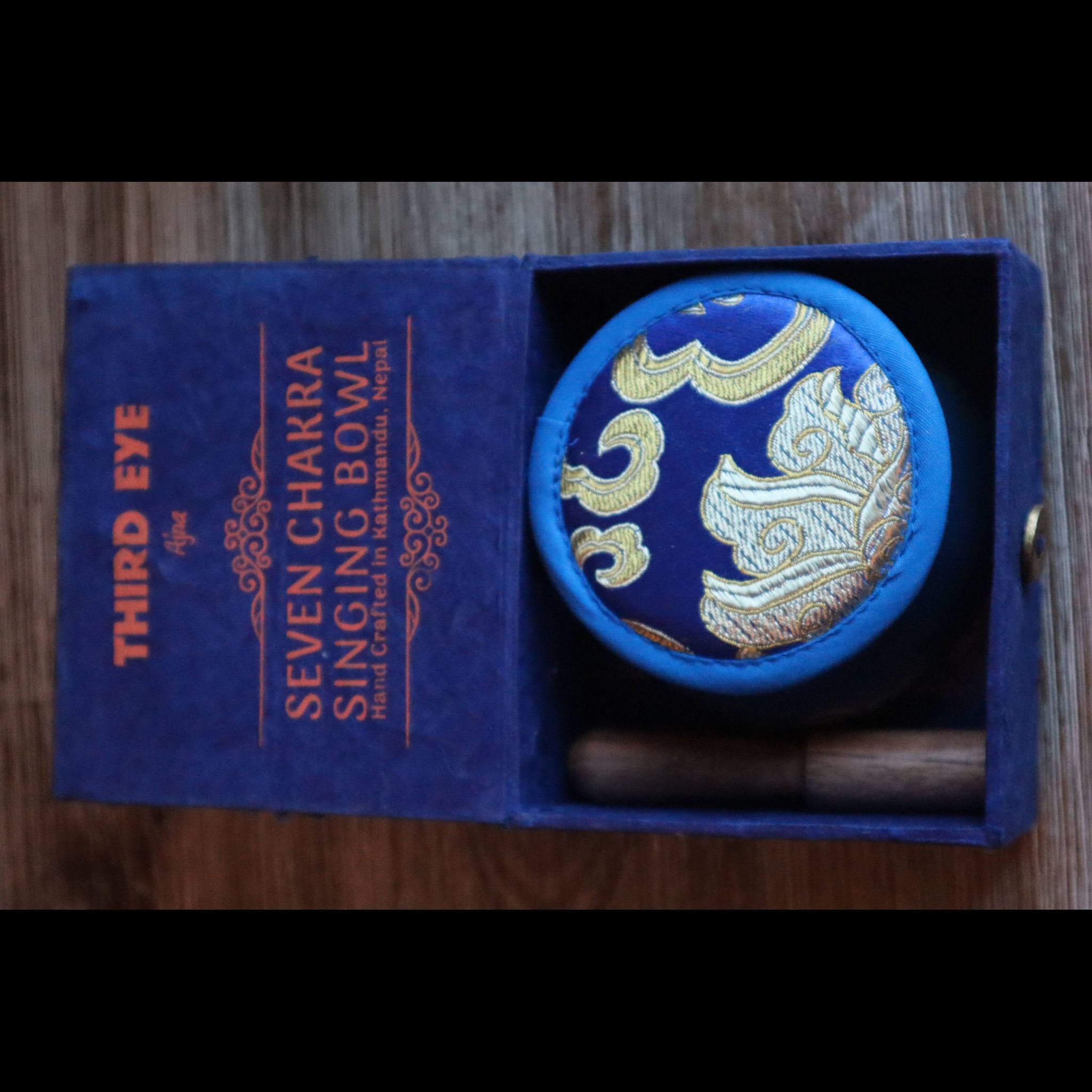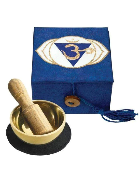 A wonderful small meditation bowl box, with a 2 in diameter bowl inside! A single tap to this little wonder brings forth a surprisingly powerful sound. A gilded third eye chakra symbol decorates the top of the box.